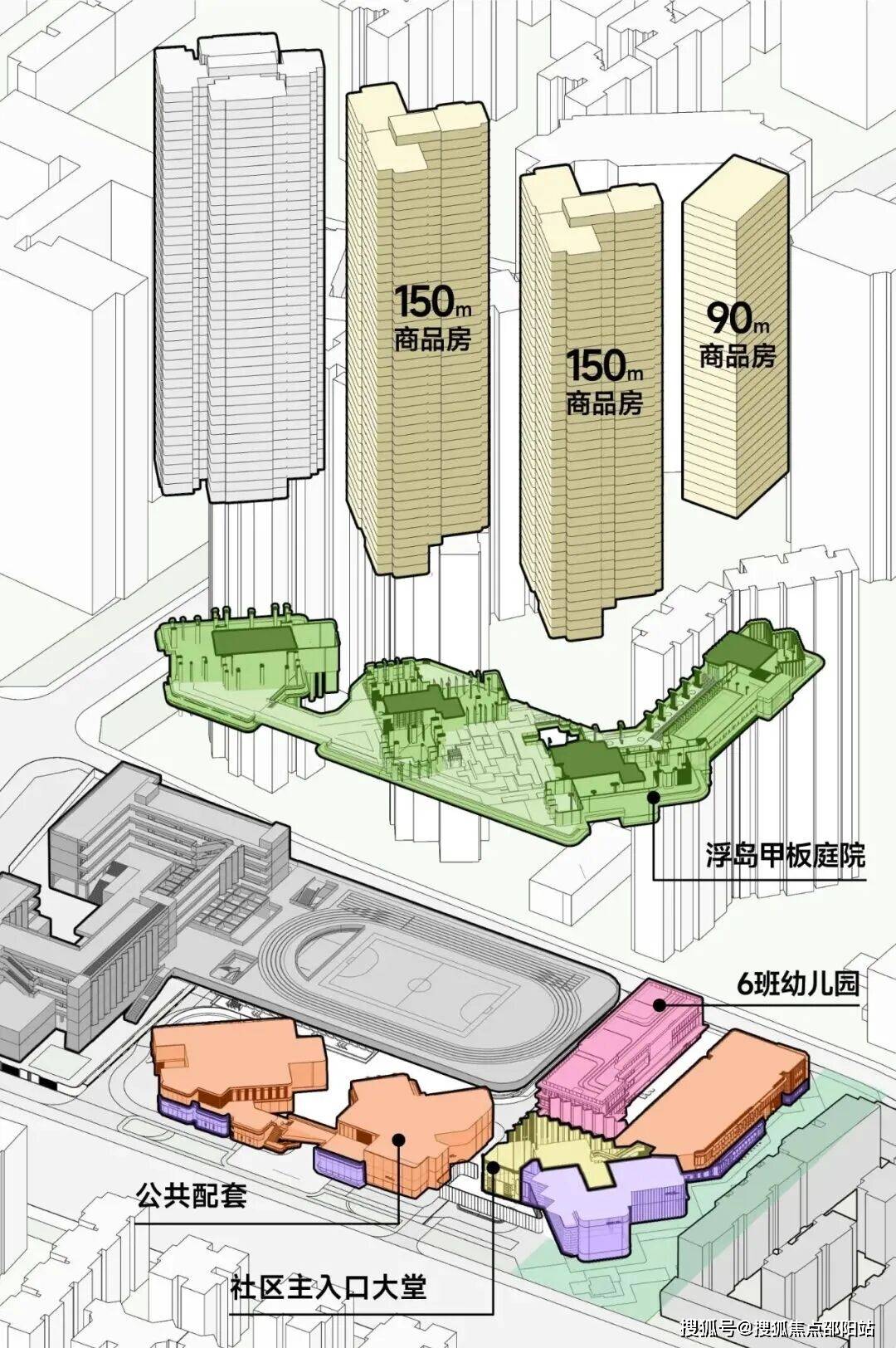 项目在设计上颇具巧思:以“浮岛甲板”为概念,将四栋住宅置于架空的绿化平台之上,形成“超级社区底盘+空中花园”的垂直生态体系。归家动线也极尽奢华——入口设天幕水景落客区,每栋配备独立入户大堂,架空层则打造为多功能会所空间,仪式感十足。