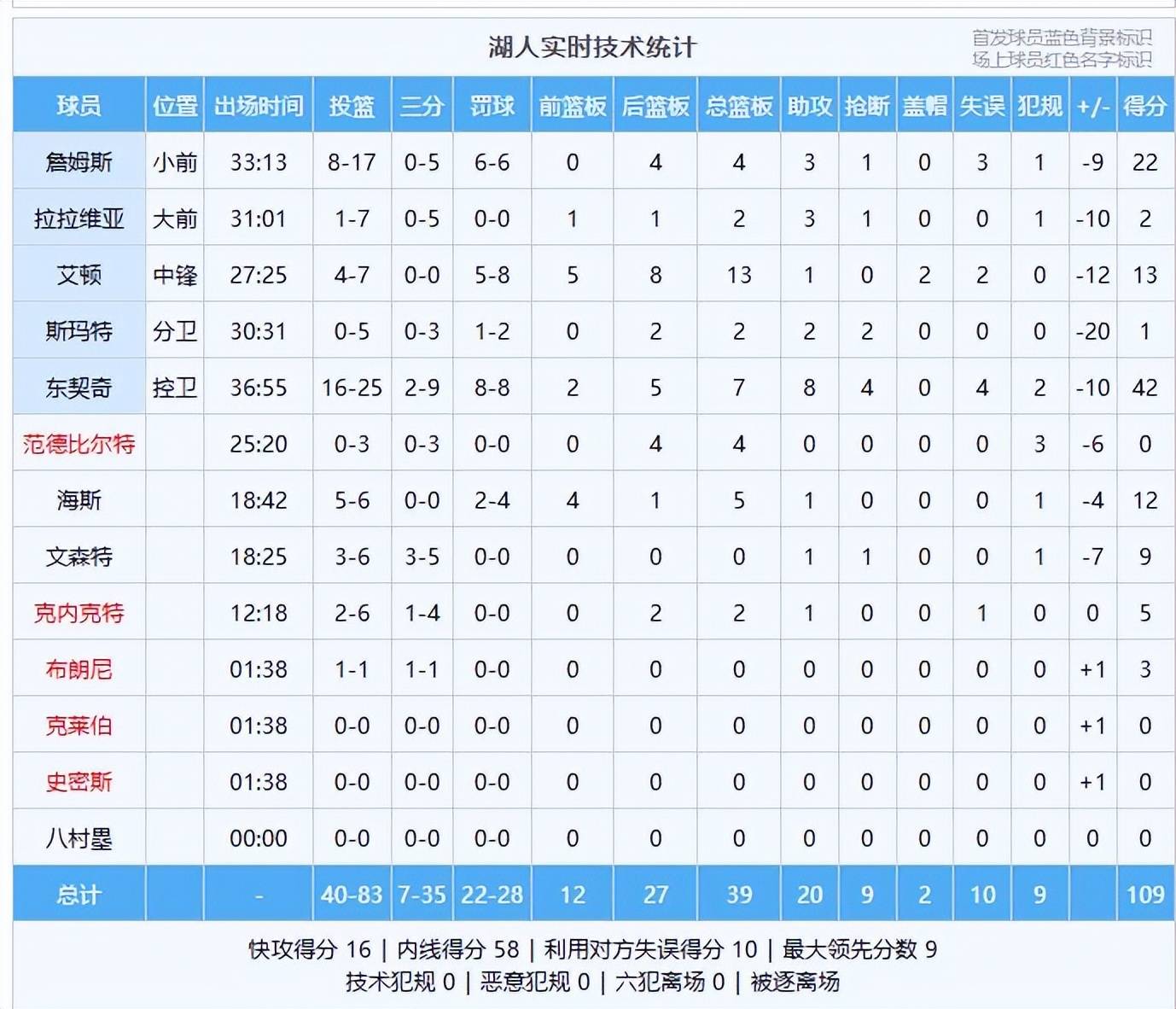 湖人数据:东契奇42分7板8助4断、詹姆斯22分4板3助、艾顿13分13板1助2帽、海斯12分5板1助、文森特9分1助、布朗尼6分、克内克特5分2板1助、拉拉维亚2分2板3助、斯玛特1分2板2助2断、范德比尔特4板、克莱伯1助